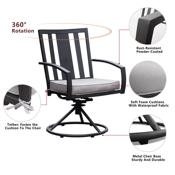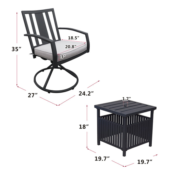Outdoor patio dining swivel chair set brings you the most comfortable and practical use experience. The ideal choice for outdoor amusement, such as a garden, porch, or yard. Enjoy the beautiful weather with your friends and relaxing life on perfect outdoor chairs. An umbrella hole in the side table at the top for installing an umbrella fits up to a 1.7-inch diameter umbrella pole.