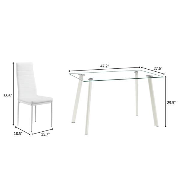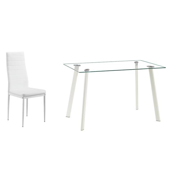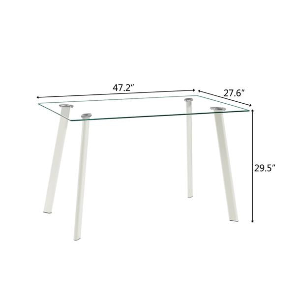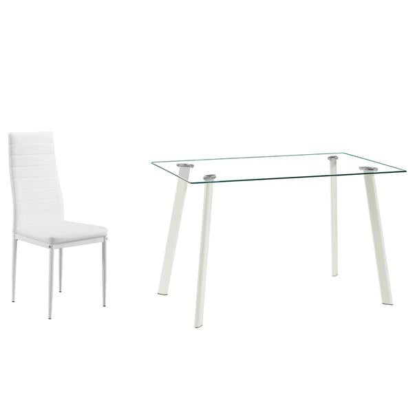 This is a simple and modern dinner table with 4 high quality leather chairs, which allows 4 people to sit around comfortably. It is suitable for kitchens, dining rooms, cafes and homes to use. The sturdy metal construction and 8mm high quality tempered glass ensure the safety and service life of the table. Meticulous rounded corners are designed to ensure the safety of the product. The simple frame structure and smooth surface make your cleaning easier and reduce the trouble of cleaning. The tempered glass dinner table is not affected by indoor air and will not be deformed due to improper humidity. In addition, it is healthy, environmentally friendly and has no radiation.
