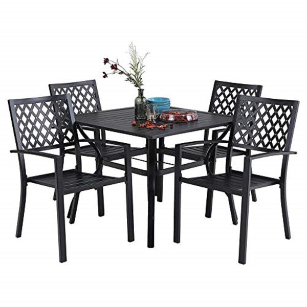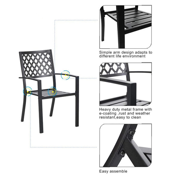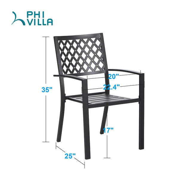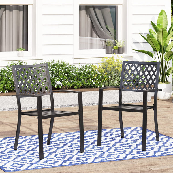 With this pair of armchairs around your patio table, you’ll be excited to invite friends and family to your next BBQ. We love the lattice design of the backs that evokes the image of pretty garden scenes. These chairs are made from rust- and weather-resistant powder-coated steel in a matte black hue. The slatted seats allow water to flow through, so you can count on them drying quickly after a passing shower. Though no cushions are included, you might want to top the seats with some of your own for an extra layer of comfort. Need to move or store them? Easy – they’re stackable!
